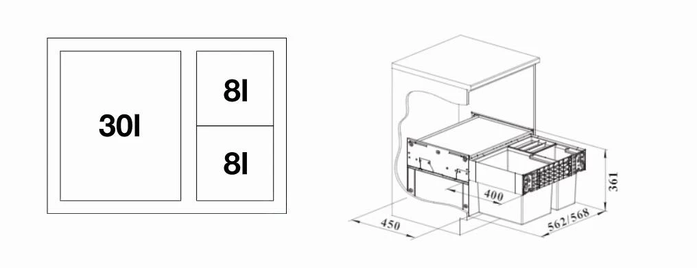 - 1 contenitore da 30 l e 2 da 8 l, compreso il coperchio
