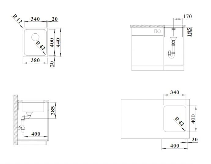 - larghezza minima del mobiletto inferiore 400 mm