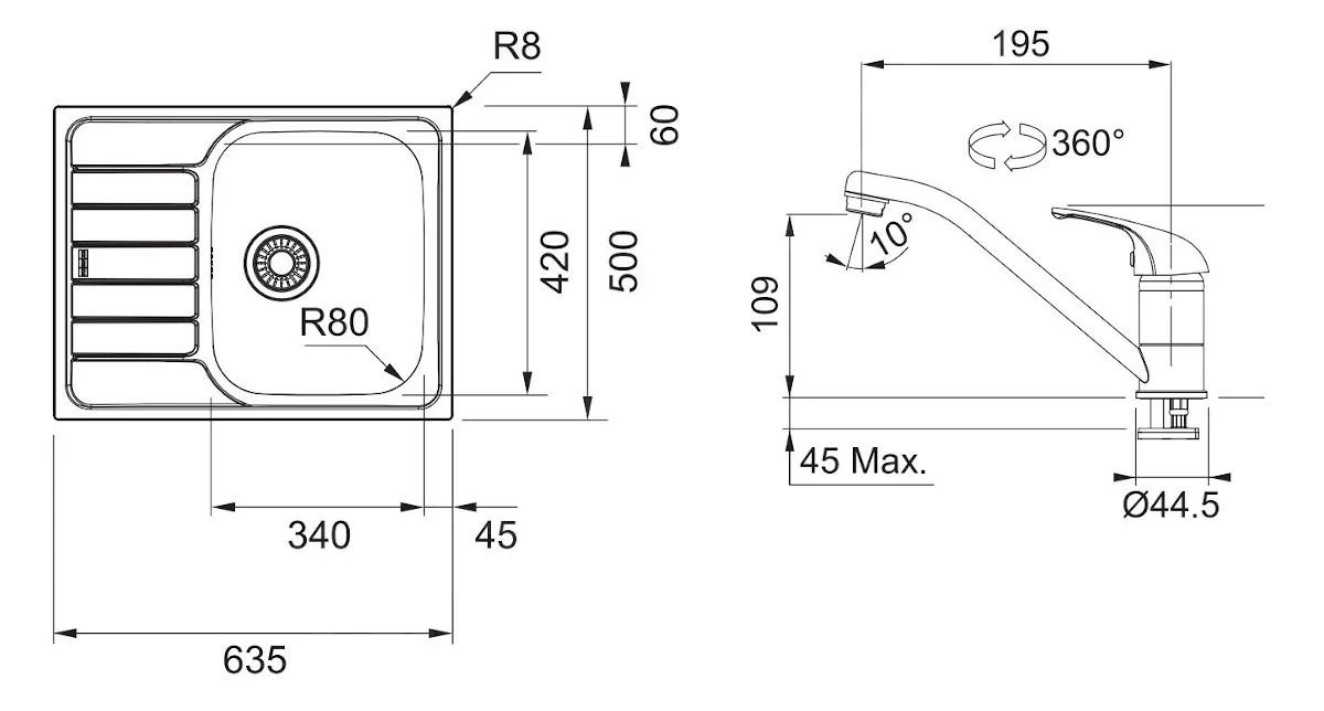 - lavello: 340 x 420 x 160 mm