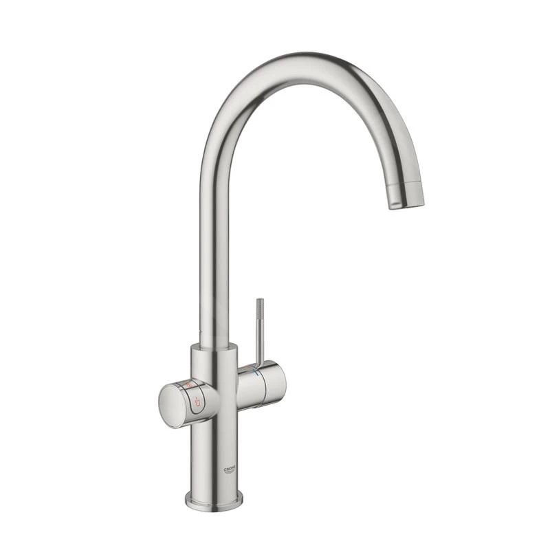 Miscelatore da cucina GROHE RED Duo (braccio di erogazione a forma di C) con set di filtraggio e caldaia di dimensione M per avere immediatamente l’acqua bollente. Finitura opaca in acciaio inox.